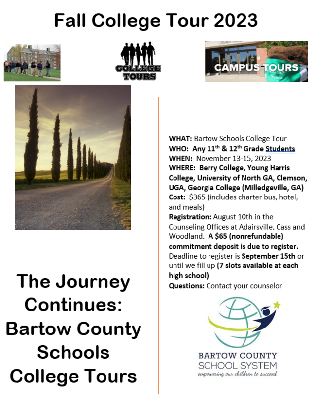 Senior and Junior students at Cass High School can now sign up to attend the Fall College Tour for the 2023-2024 school year this November 13-15! This tour takes students behind the scenes at some phenomenal college campuses across Georgia and South Carolina, including UGA, Clemson, Berry College, and more! Registration is open now, and there are a very limited number of spots available! Forms and deposits must be submitted no later than September 15th, and spots are available on a first come, first serve basis! See below for more information and to find all forms that must be received in order to attend. For any other questions or to register, please contact your school counselor!