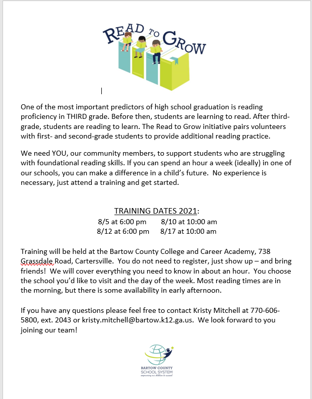 We are looking for amazing volunteers from our community to join the Read to Grow initiative to provide additional reading practice. This is a great way to have a positive impact on a child's future and the Pine Log community. Please read this flyer to learn about the upcoming trainings.