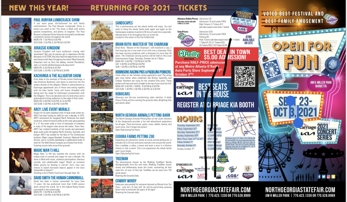 The Fair is OPEN FOR FUN! Normally the North Georgia State Fair delivers a brochure with a Student’s School Special for free admission and rides to the individual schools. However, due to increased security measures they are handling the brochure distribution differently this year. We have attached a digital version of the same brochure that includes the free admission and ride ticket (back side of the brochure).